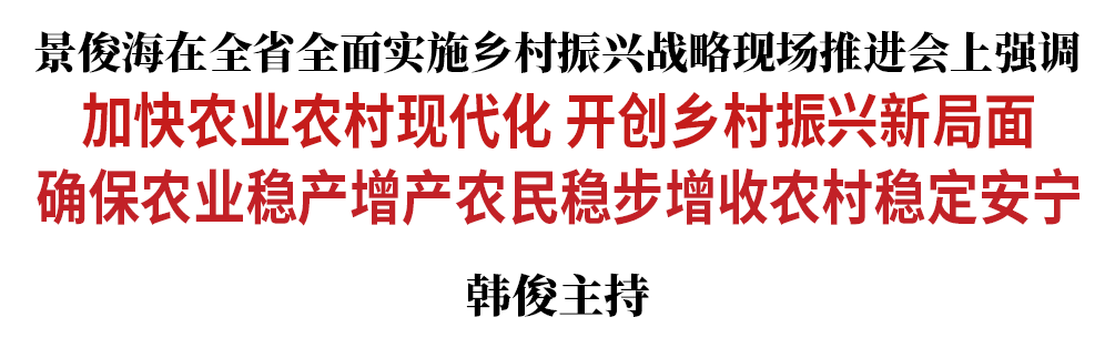 在充分肯定全省乡村振兴工作后,景俊海强调,吉林要振兴,乡村必振兴。一要全面推进乡村振兴战略落地见效,进一步完善乡村产业体系,推进农村一二三产深度融合,抓好乡村建设行动,加快城乡融合发展。二要坚决扛稳维护国家粮食安全重任,扎实推进“千亿斤粮食”生产工程,加强耕地保护建设和种业振兴发展,培育壮大农产品深加工和食品细加工万亿级大产业。三要扎实推进共同富裕,持续巩固拓展脱贫攻坚成果,放手发展富民产业,积极支持农民就业创业,提升公共服务水平,不断改善农村生产生活条件。四要深度激活乡村振兴内生动力,稳妥推进第二轮土地承包试点,持续壮大新型农业经营主体,精准推进农村金融改革。五要不断提升乡村振兴工作效能,切实加强组织领导,精心建好人才队伍,持续强化投入保障,抓实基层基础建设,着力搞好宣传引导,努力营造乡村振兴浓厚氛围。
