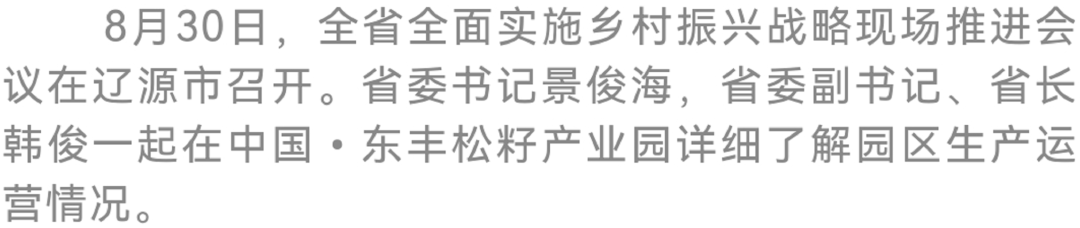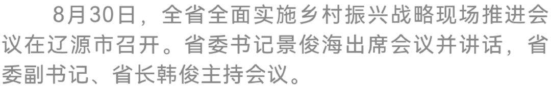 8月30日,全省全面实施乡村振兴战略现场推进会在辽源市召开。省委书记景俊海出席会议并讲话。他强调,要深入贯彻习近平总书记关于乡村振兴的重要论述和视察吉林重要讲话重要指示精神,加快农业农村现代化,开创乡村振兴新局面,确保农业稳产增产、农民稳步增收、农村稳定安宁。省委副书记、省长韩俊主持会议。