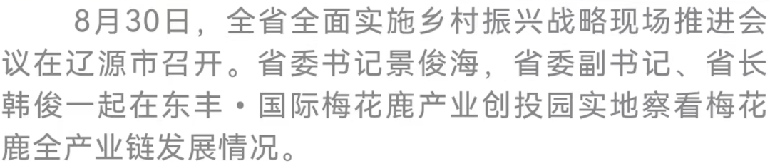 会前,景俊海、韩俊率领与会人员深入东丰县实地调研。在六禾现代农业田园综合体和东丰·国际梅花鹿产业创投园,景俊海详细了解运营情况,强调要坚持产学研用协同发力,大力发展新业态新模式,吸引更多城里人上山下乡,带活农村经济、促进农民增收。景俊海来到中国·东丰松籽产业园,强调要树立大农业观、大食物观,全方位开发食物资源,让更多吉林特色农产品进厨房、上餐桌、装口袋。在农光旅互补生态园,景俊海要求坚持生产、生活、生态“三生”融合,进一步拓展农业增值空间。景俊海来到榆林农民画村,与农民画家亲切交流,鼓励他们把精湛技艺传承下去、发扬光大,更好展现乡村新风貌、描绘生活新画卷。