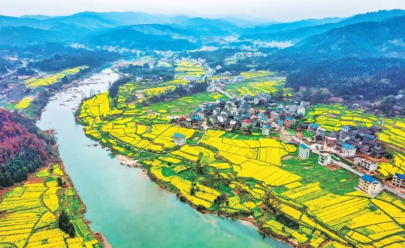 民族要复兴,乡村必振兴。财政部门完善多元化投入机制,加快农业农村现代化,推进乡村全面振兴。图为2024年3月9日,湖南省怀化市通道侗族自治县县溪镇香坪村,金黄的油菜花田与村庄、青山、绿水相互辉映。 人民图片 田其珍/摄