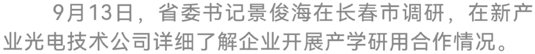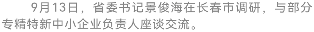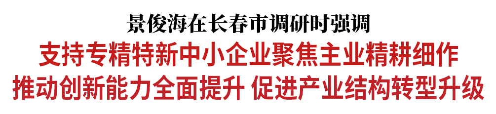 9月13日,省委书记景俊海在长春市调研。他强调,要深入贯彻习近平总书记致2022全国专精特新中小企业发展大会重要贺信精神,支持专精特新中小企业聚焦主业、精耕细作,推动企业创新能力全面提升,促进区域产业结构转型升级,为吉林高质量发展提供不竭动力。
