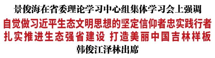 在“吉林生态日”即将到来之际,省委书记景俊海今天主持召开省委理论学习中心组集体学习会。他强调,要自觉做习近平生态文明思想的坚定信仰者和忠实践行者,深入学习贯彻《习近平生态文明思想学习纲要》,扎实推进生态强省建设,努力打造美丽中国吉林样板。省委副书记、省长韩俊,省政协主席江泽林出席会议。
