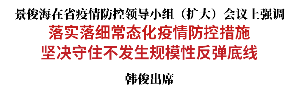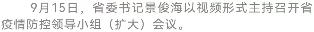 9月15日,省委书记景俊海以视频形式主持召开省疫情防控领导小组(扩大)会议。他强调,要深入贯彻习近平总书记关于高效统筹疫情防控和经济社会发展的重要讲话重要指示精神,坚持人民至上、生命至上,以“时时放心不下”的责任感,落实落细常态化疫情防控措施,坚决守住不发生规模性反弹底线,为党的二十大胜利召开营造安全稳定社会环境。省委副书记、省长韩俊出席会议并讲话。