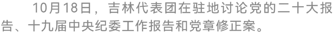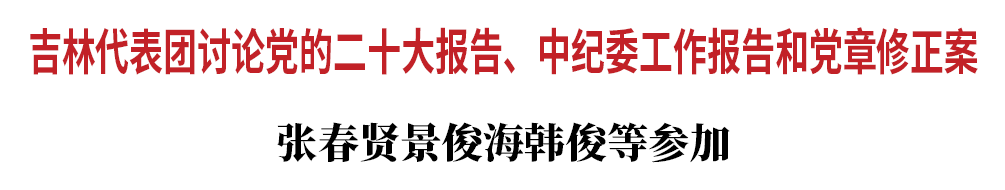 10月18日,吉林代表团在驻地讨论党的二十大报告、十九届中央纪委工作报告和党章修正案,传达了王沪宁同志在党的十九届七中全会上关于党章修改工作的说明。代表们一致认为,习近平总书记所作的报告,高举旗帜、蓝图宏伟、路径清晰、催人奋进,是一篇闪耀着马克思主义真理光芒的纲领性文献;中央纪委工作报告,通篇贯穿了习近平新时代中国特色社会主义思想,是新时代推进党风廉政建设和反腐败斗争的行动指南;党章修正案反映了全党的共同意志和全国人民的共同心声,是统一全党思想行动、凝聚全党智慧力量、激励全党团结奋斗的重大举措。大家一致表示,坚决拥护、完全赞同党的二十大报告、中央纪委工作报告和党章修正案。