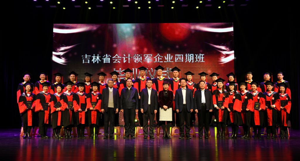 财政部崔华清处长、省财政厅张言副厅长、省人社厅张立福副厅长、吉林大学王玉柱副校长、省财政厅会计处王文玉处长、吉林大学管理学院李北纬院长和毕业学员合影留念